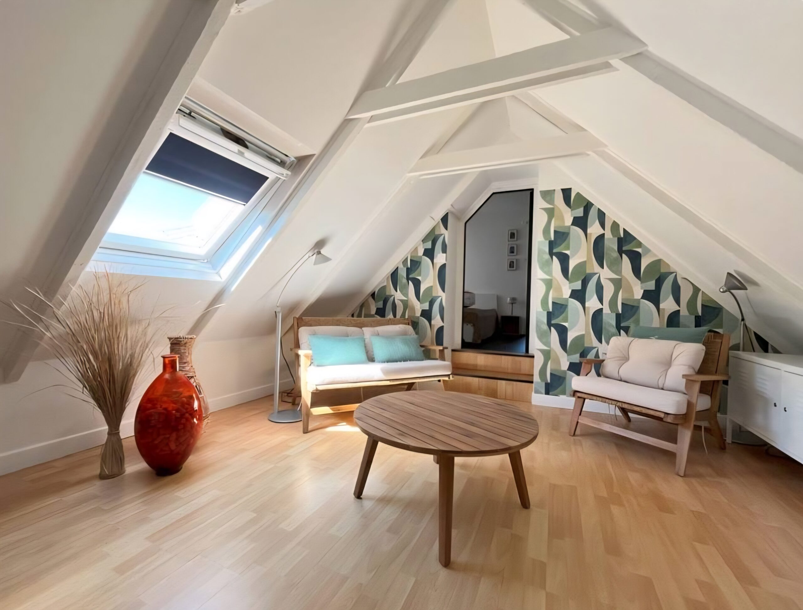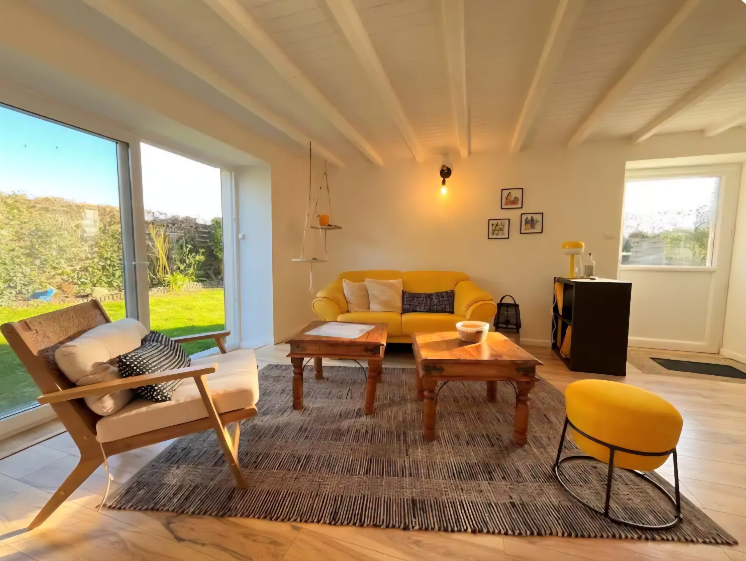 Salon lumineux avec vue sur le jardin clos et accès direct à l’extérieur.
