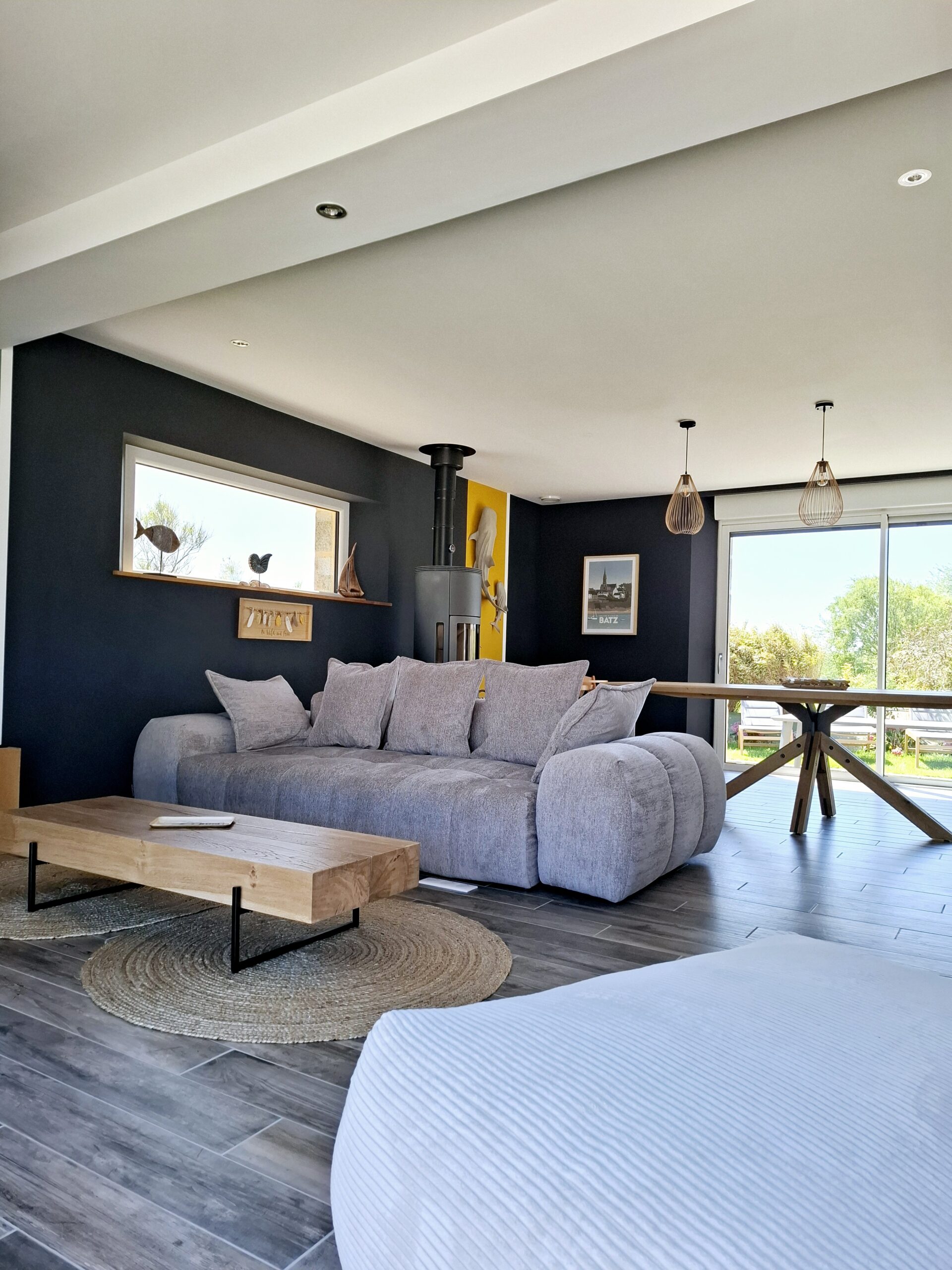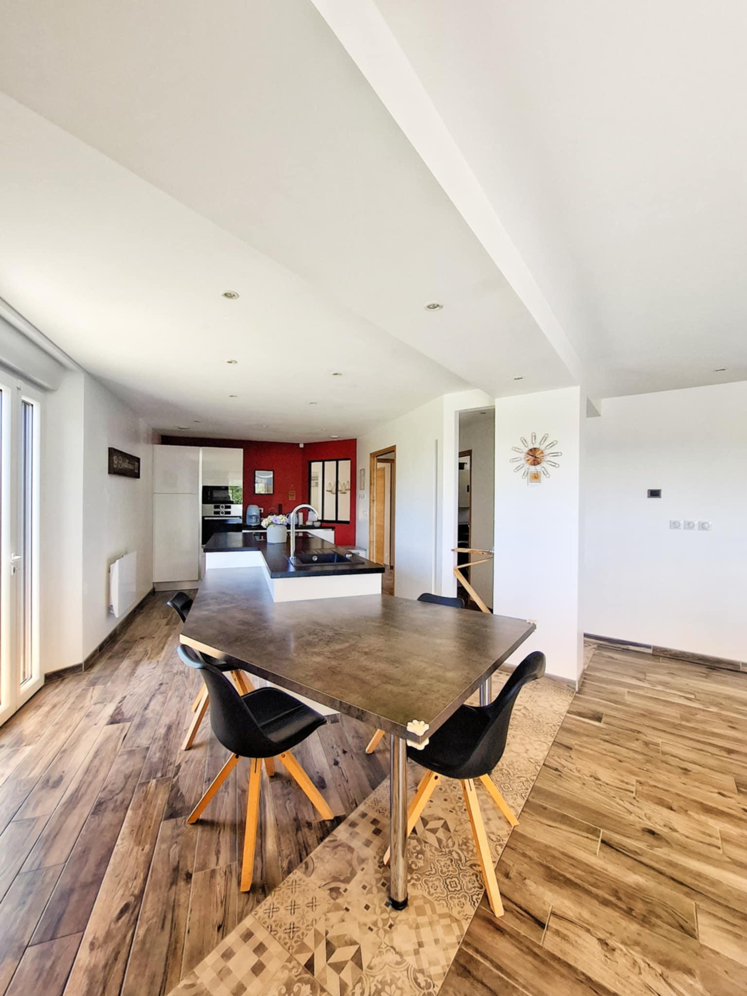 La maison s’ouvre sur un vaste séjour baigné de lumière, prolongé par une cuisine équipée où l’on prépare avec plaisir de bons repas à partager autour d’une grande table conviviale. Chaque espace respire l’attention portée aux détails et à la qualité.