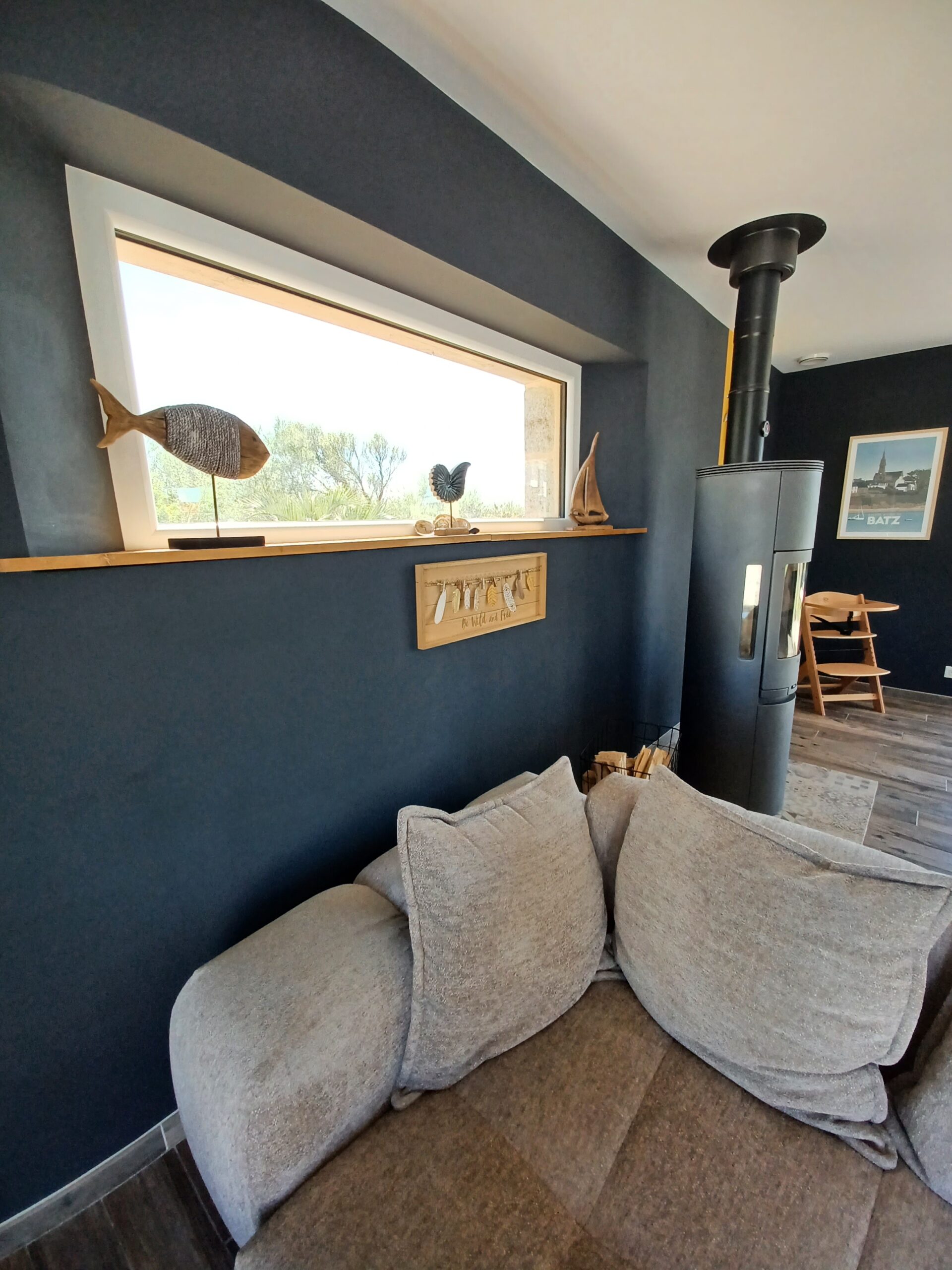 Elle compte quatre chambres spacieuses, dont une élégante suite parentale avec douche à l’italienne pour un réveil tout en douceur. Un espace sauna privatif a été aménagé pour prolonger les instants de bien-être, idéal après une journée iodée sur les sentiers côtiers. Le reste de la famille peut profiter d’une deuxième salle de bain équipée d’une baignoire balnéo, parfaite pour se détendre après une balade sur la plage.
