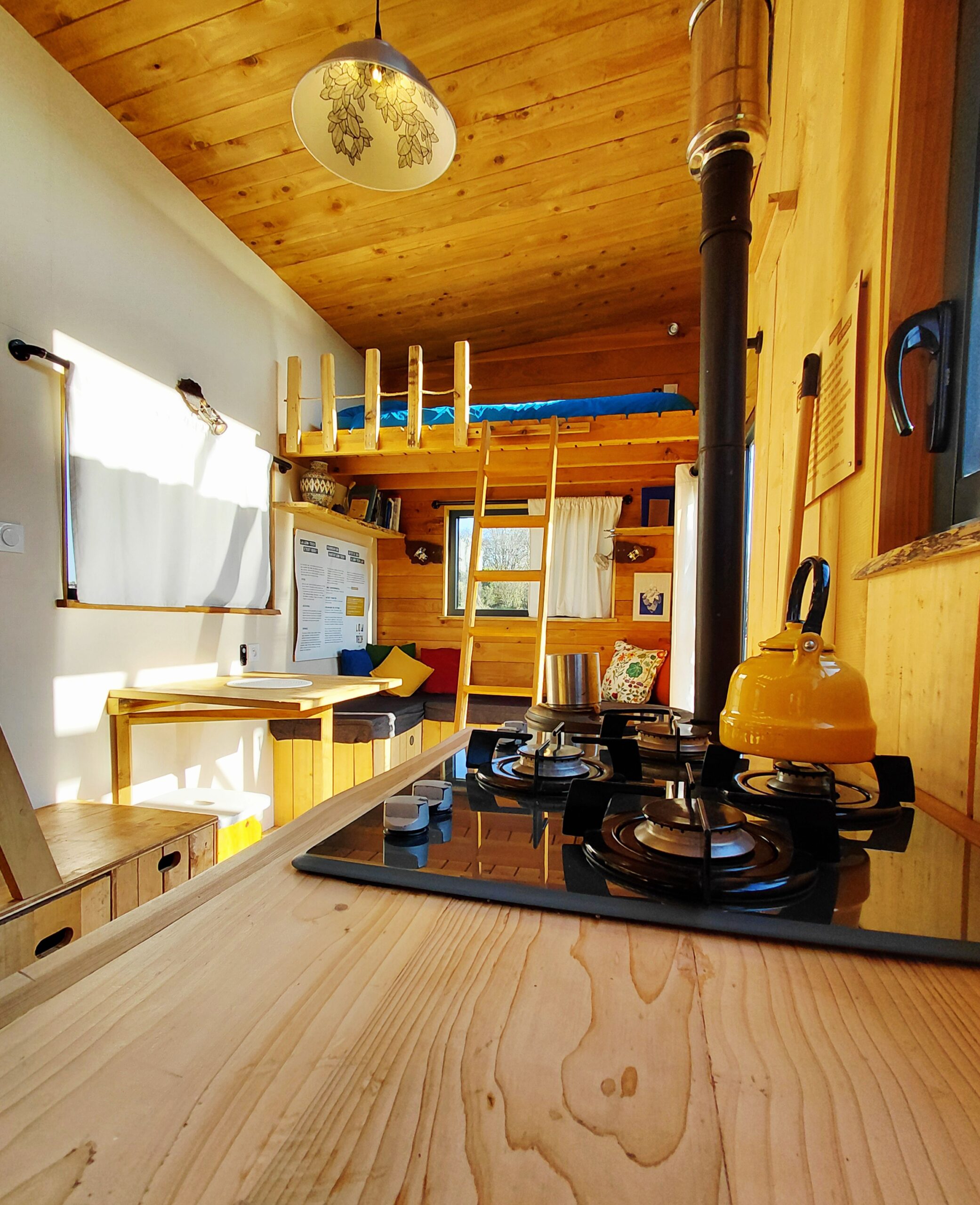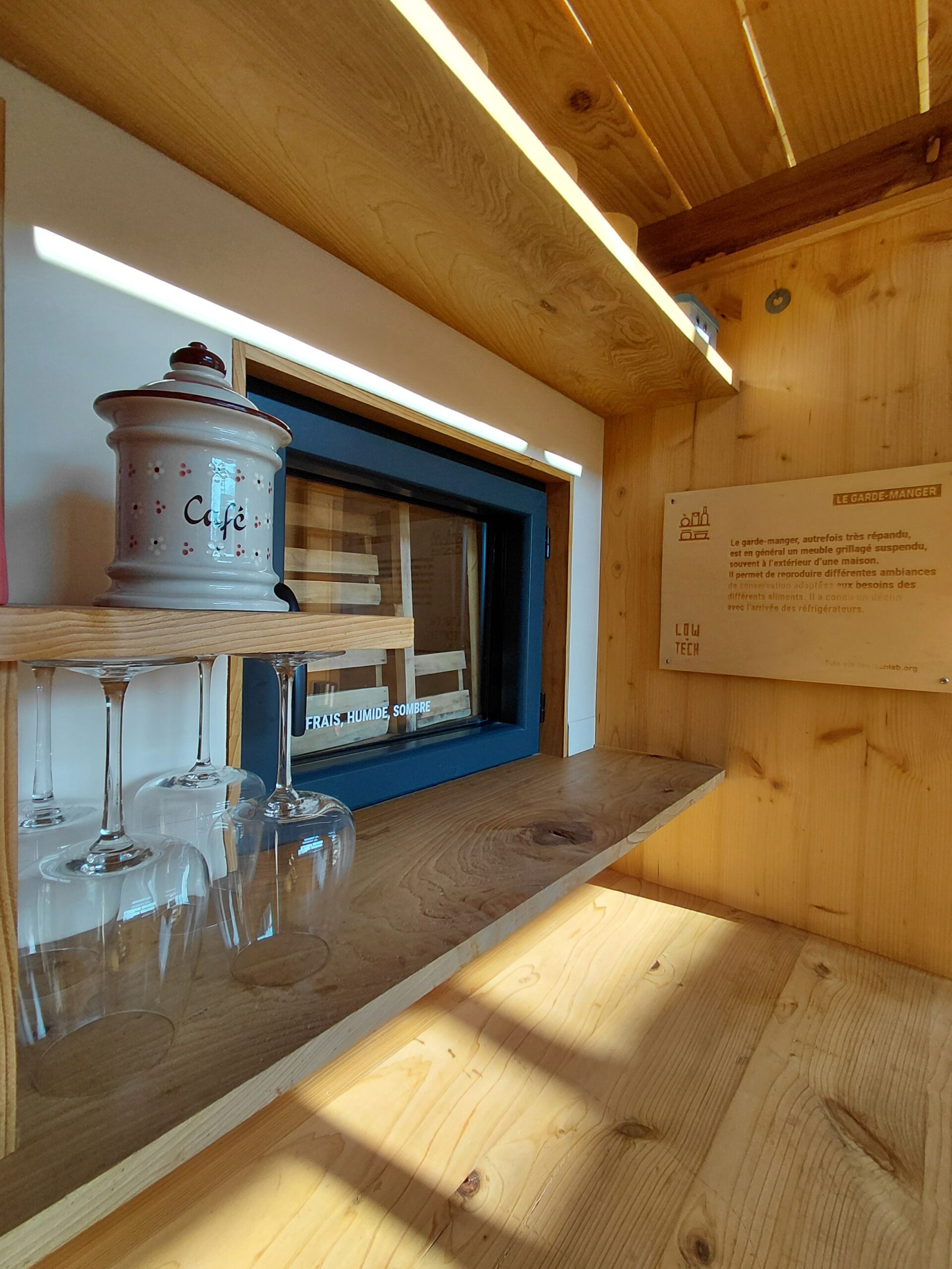 La cuisine, elle, raconte une autre manière d’habiter le monde : plaques à gaz, marmite norvégienne, réfrigérateur, garde‑manger, poêle de masse, filtre à eau… Ici, on cuisine lentement, on savoure, on retrouve le goût des choses simples.