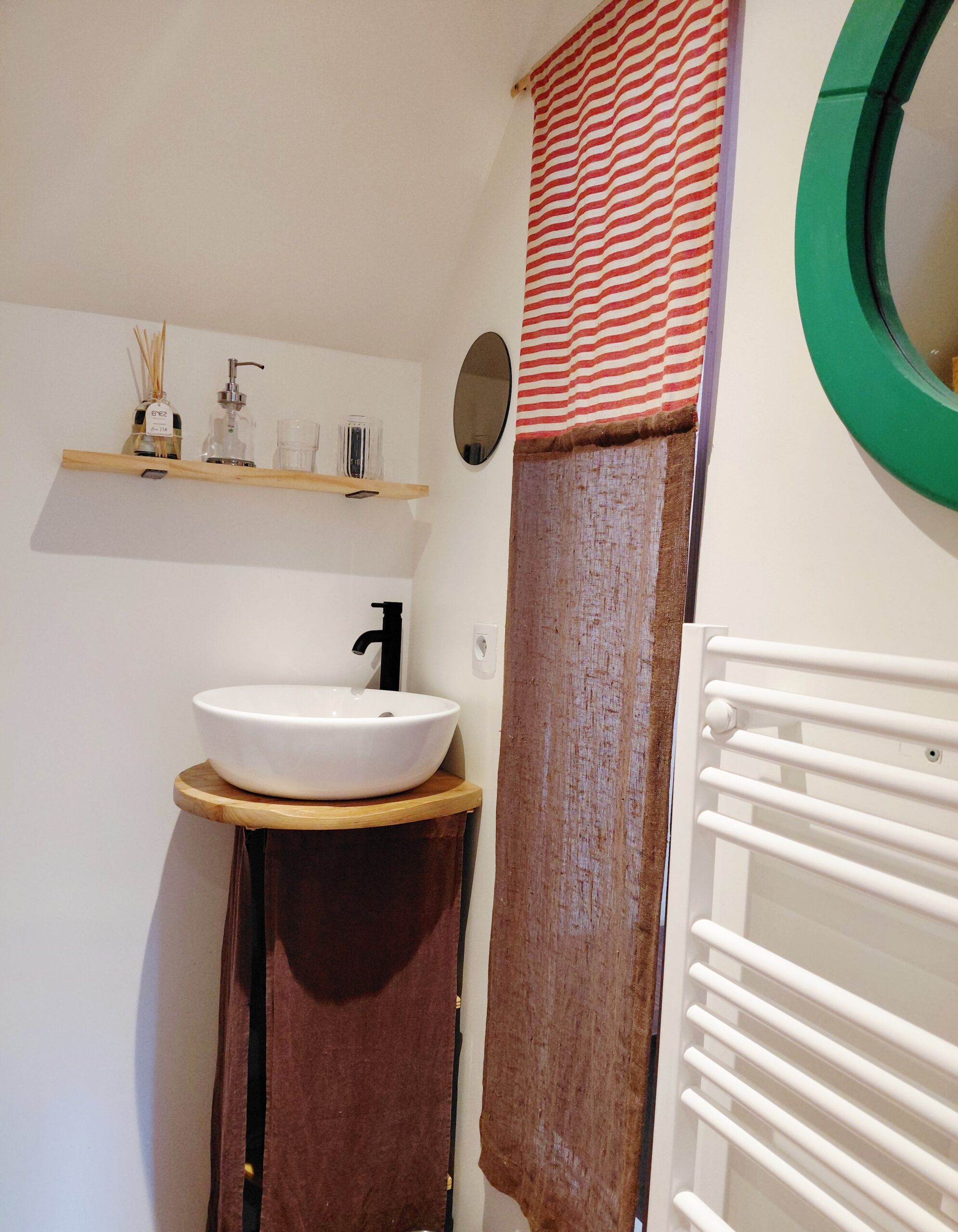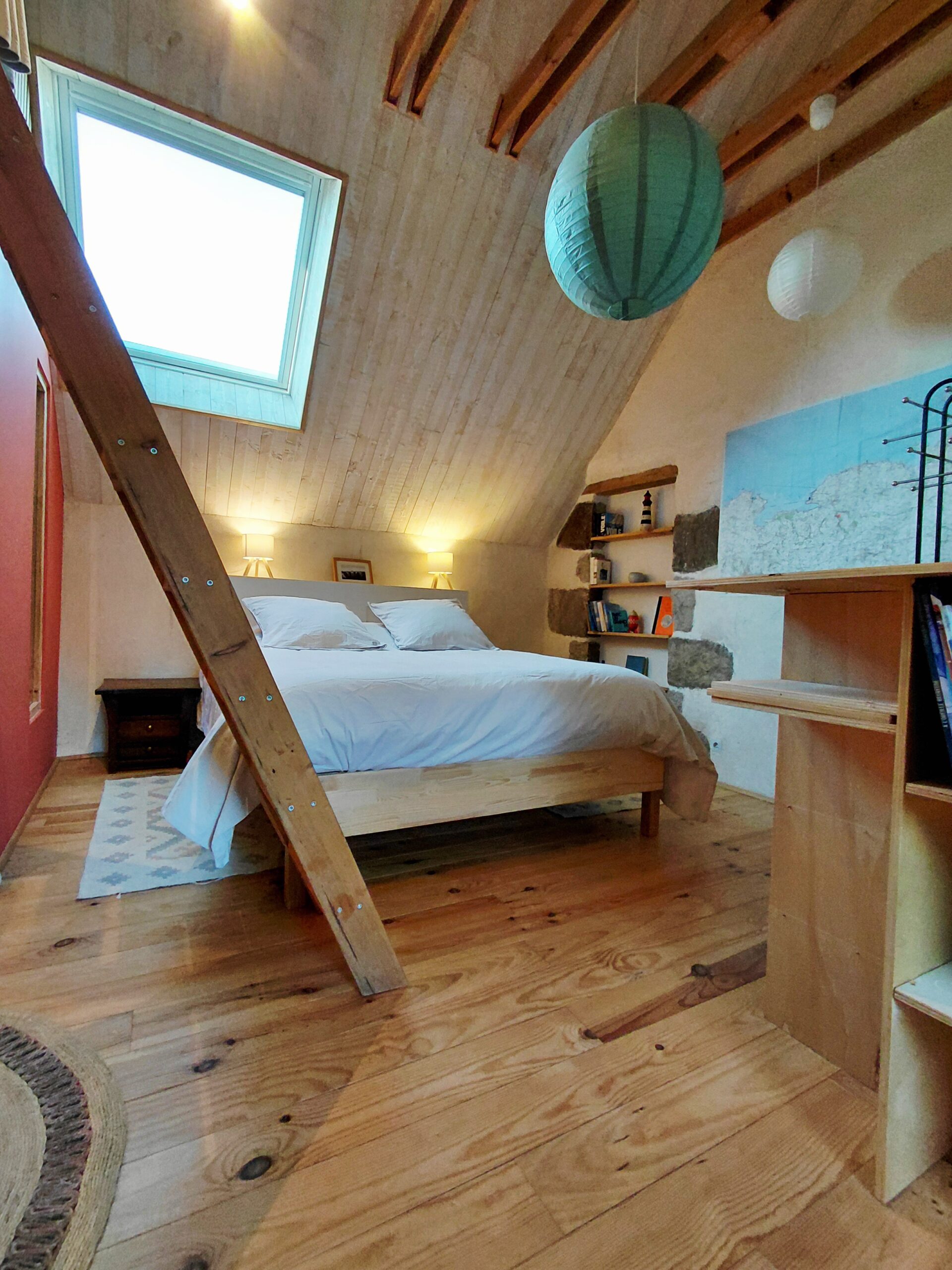 La grande chambre, baignée de lumière, accueille un lit double (160×200) où l’on dort profondément, bercé par le calme environnant. Un coin salon intime, une salle de bain avec une grande douche… tout y est simple, chaleureux, essentiel.
