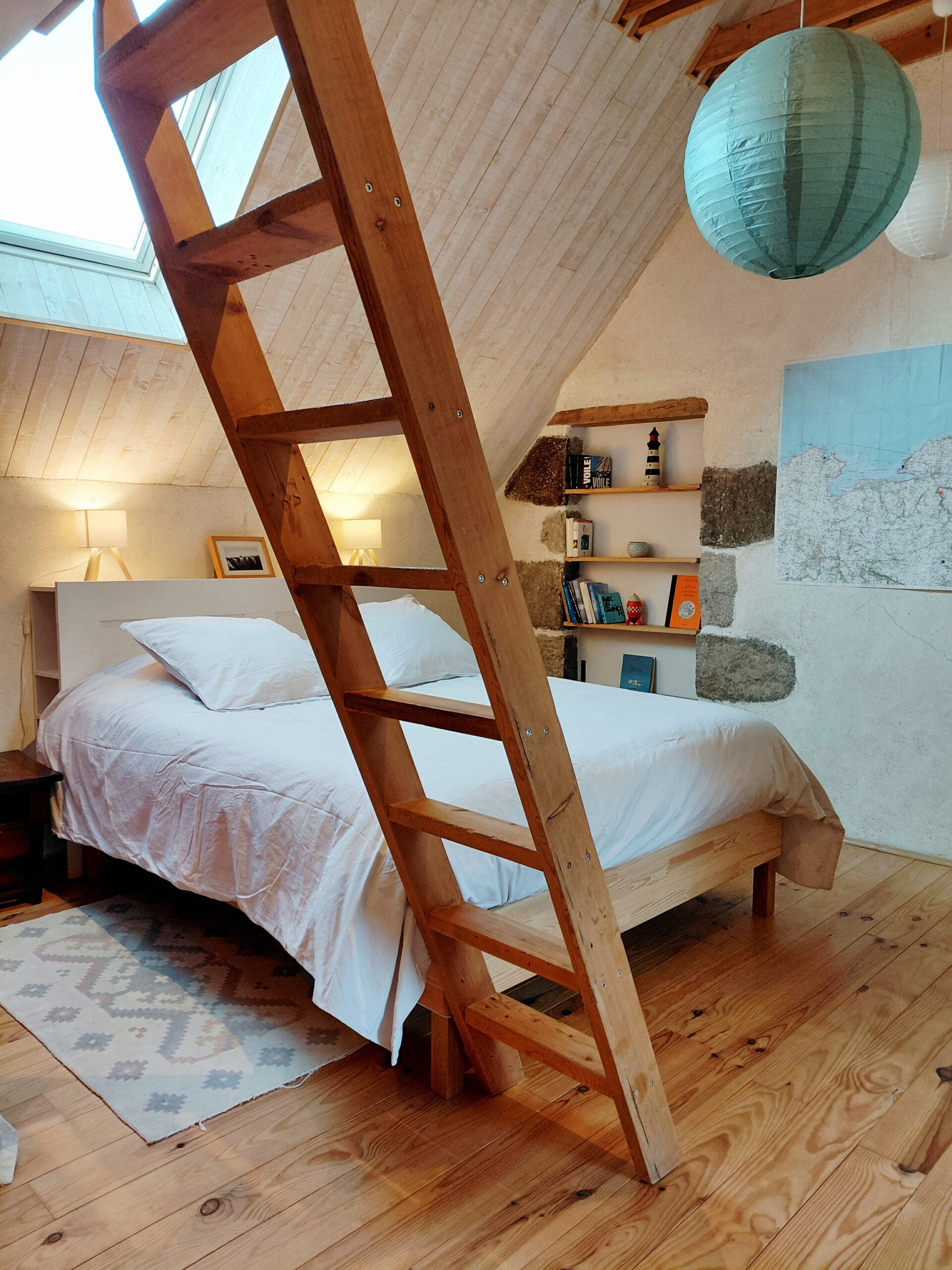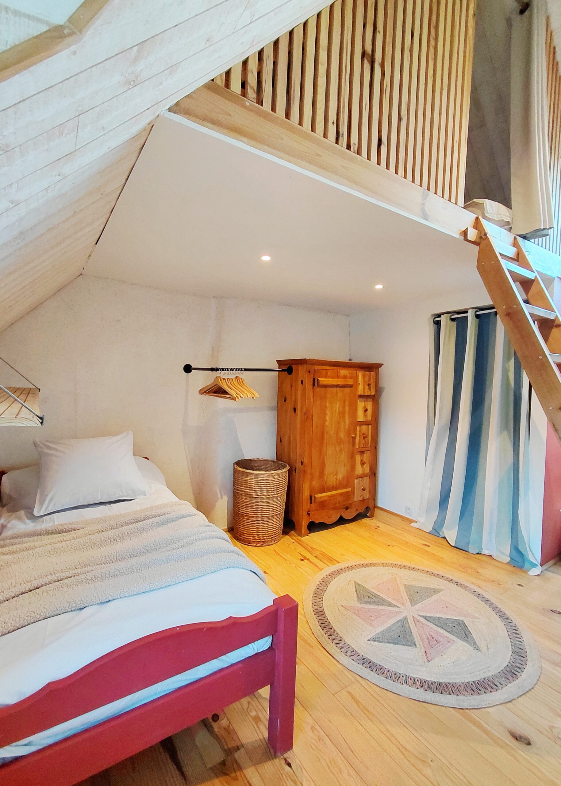 Et puis, il y a la mezzanine : accessible par une échelle, deux lits simples perchés comme dans une cabane secrète. Un velux, une fenêtre, une lumière douce… Les rideaux occultants permettent de plonger la pièce dans un noir total, pour des nuits profondes et paisibles.