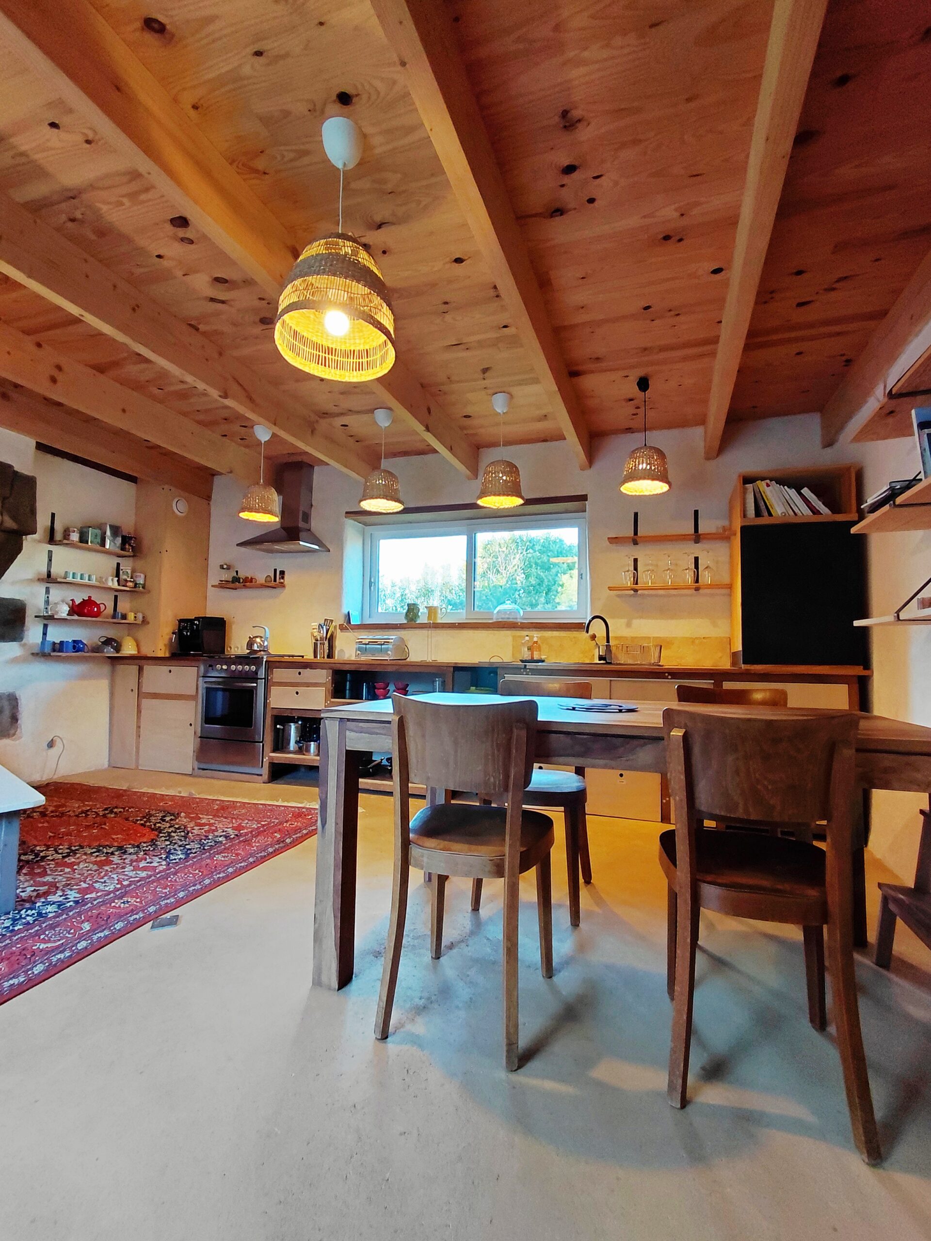 Ici, l’écologie n’est pas un concept : c’est une évidence. La dalle en argile, les murs en chaux‑chanvre, le bois, la chaux… Tout respire le naturel, la santé, la sérénité.